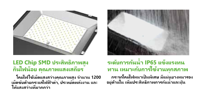 เลือกใช้ LED Chip ที่ให้ความสว่างแต่กินกำลังไฟน้อยทำให้โคมไฟมีประสิทธิภาพส่องสว่างสูงถึง 150LM/W