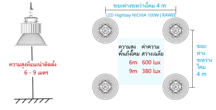 ค่าความสว่างเฉลี่ย(ลักซ์)ที่ระดับความสูงและระยะห่างที่แนะนำสำหรับโคมไฟไฮเบย์ ราคาประหยัด (NICHIA LED)